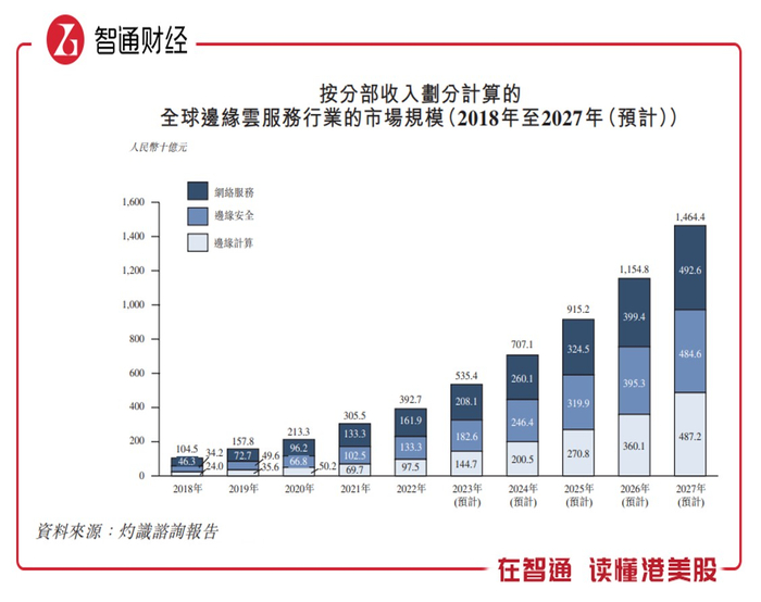 从行业来看,根据灼识咨询报告,2022年全球边缘云服务行业的市场规模3927亿元,近五年复合增速为39.23%,预计到2027年将达14644亿元,复合增长率30.1%。中国边缘云服务行业及东南亚和中东等新兴市场的边缘云服务将在2022年至2027年的未来五年内大幅增长,复合年增长率均超过30%。
