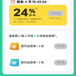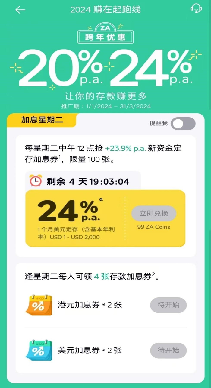 众安银行近期推出一项跨年优惠活动“2024赚在起跑线”,每周二中午12点,个人用户可上线抢购加息券,加息券利率高达23.9%,加上基础利率,年化收益最高可达24%。值得一提的是,用户每周二都有机会领取2张港元加息券和2张美元加息券,意味着无论存款是港元还是美元,都能享受这一福利。