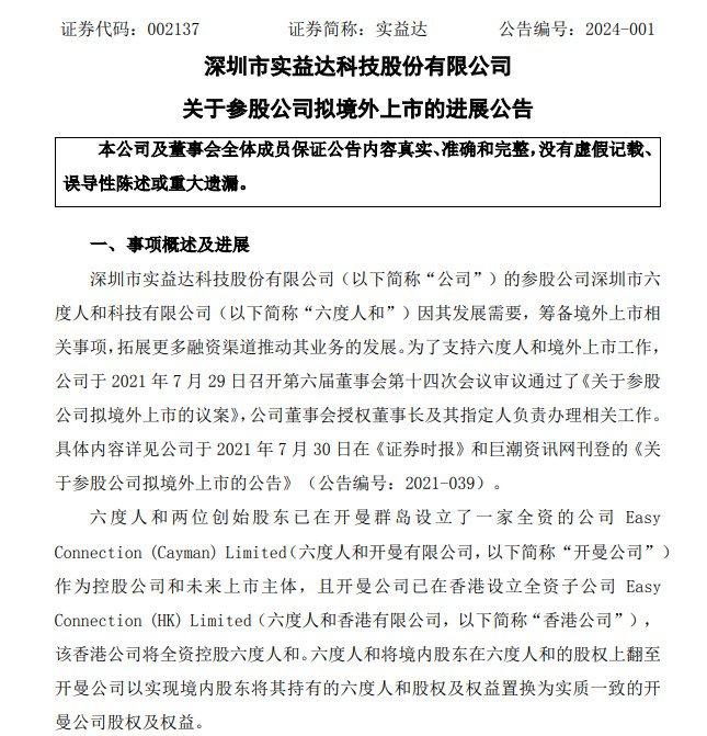 1月4日,实益达(002137.SZ)公告,其参股公司深圳市六度人和科技有限公司(六度人和)因其发展需要,筹备境外上市相关事项,拓展更多融资渠道推动其业务的发展。根据公告信息披露的上市主体注册地,六度人和或前往香港或美国上市。