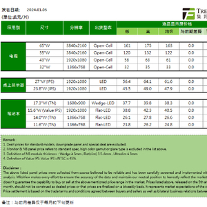 根据TrendForce集邦咨询调研数据,2024年1月上旬,各尺寸电视、显示器、笔记本面板价格维持不变。其中,在笔记本方面,14.0吋TN面板价格自2023年10月上旬至今保持稳定,本期均价为为26.6美元,最低报价26.1美元,最高报价27.8美元;11.6吋TN面板价格自2022年11月下旬至今保持稳定,本期均价为24.8美元。最低报价23.8美元,最高报价26.2美元。