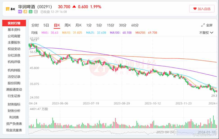 2024年已拉开帷幕,华润啤酒(00291)的投资者未等到其股价走势峰回路转,“熊市不言底”的走势仍在延续。智通财经注意到,华润啤酒股价于1月8日创出29.3港元近46个月新低,较76.85港元的历史高点跌幅超过60%,市值蒸发近1500亿港元。