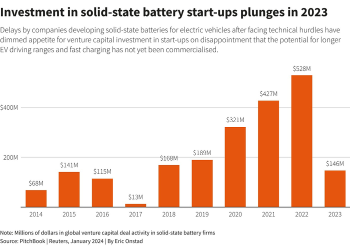 固态电池行业缺乏商业成功对市场热情造成了打击。PitchBook的数据显示,2023年固态电池公司的全球风险投资交易金额下降了72%,至1.46亿美元。Ibex Investors合伙人Jeff Peters表示:“投资者对固态电池的兴趣已经减弱。他们在质疑是否值得冒这个风险。”