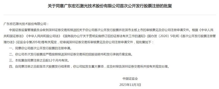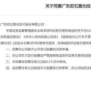1月25日,证监会发布《关于同意广东宏石激光技术股份有限公司首次公开发行股票注册的批复》。宏石激光拟在深交所主板上市,此次IPO的保荐人为中信证券,拟募资14.106亿元。