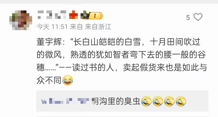 值得一提的是,东方甄选五常大米事件中,被攻击最多的是董宇辉。毕竟把这款大米带火的正是他,直播中为产品背书的也是他,自然也就承受了更多骂名。