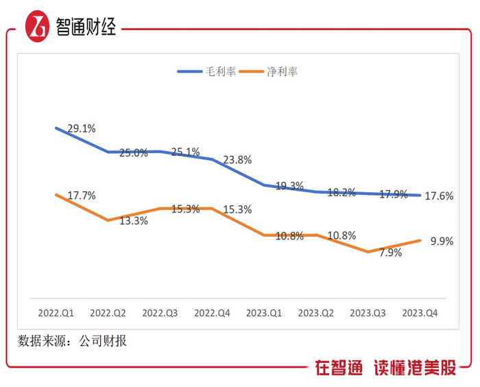 其实最令投资者头疼的是,特斯拉的盈利能力季度持续下滑,2023年Q4,其毛利率及股东净利率分别为17.6%及9.9%,相比于2022年Q1分别下滑了11.5个百分点及7.2个百分点。毛利率下滑比较显著,这和上文提到的价格战密切相关,2024年价格战将更为激烈,使得该公司盈利趋势更加悲观。