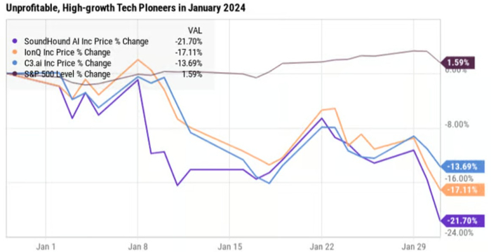 归根结底,经济波动是导致SoundHound AI 1月份股价下跌的主要原因,主要与C3.ai(AI.US)和IonQ(IONQ.US)等公司的股价同步下跌。与SoundHound AI一样,这些公司亏损严重,专注于有前景但风险很大的技术市场中的极端增长机会。企业级人工智能服务提供商C3.ai 1月份收盘下跌13.7%,而量子计算先驱IonQ下跌17.1%。