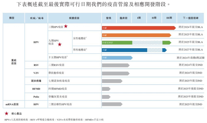 除此之外,公司的另一项核心产品III期九价HPV候选疫苗,则预计将成为首批获准用于女性的国产九价HPV候选疫苗之一,计划于2025年在中国提交BLA,该疫苗也是中国首个开始对男性进行关键效力试验的国产九价HPV候选疫苗。
