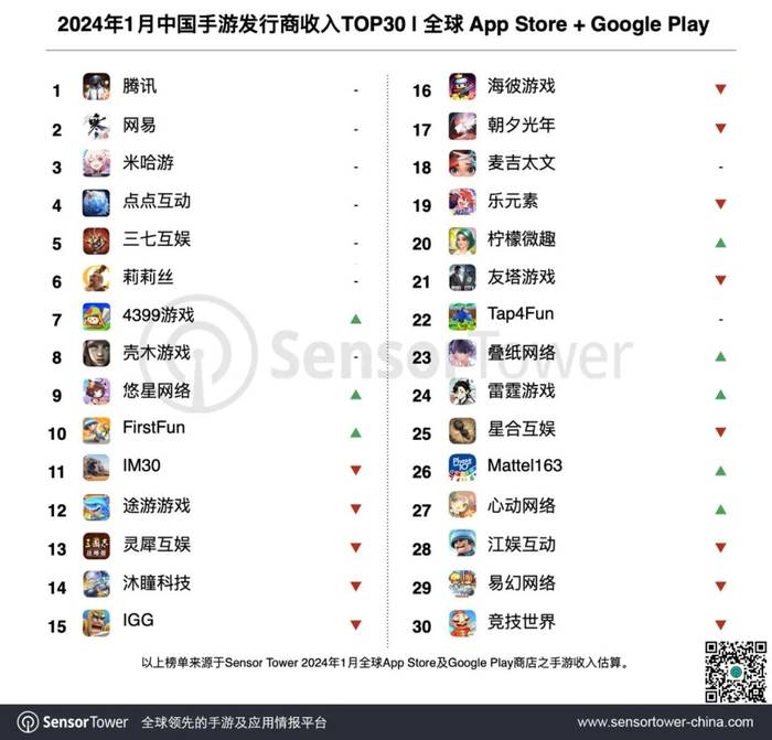 Sensor Tower:1月共38个中国厂商入围全球手游发行商收入榜TOP100 合计吸金19.6亿美元