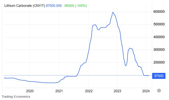 但自2023年12月7日以来,中国碳酸锂现货价格一直趋于稳定,过去两周从95500元反弹至97500元。那么,这是否意味着锂价终于触底呢?以下图表或许能解答这个问题。