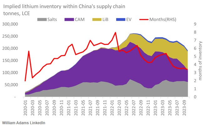 分析师William Adams预计,随着阴极制造商的补充库存增加,锂订单将在2024年第一季度末/第二季度初开始向上游流动。