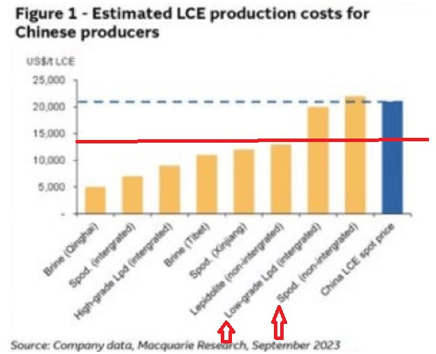 下面这张来自麦格理的2023年9月的图表显示了中国各锂生产商的生产成本。早在2023年9月,碳酸锂现货价格约为21000美元/吨(蓝色虚线),在这个价格上,中国非一体化锂辉石生产商开始变得无利可图。