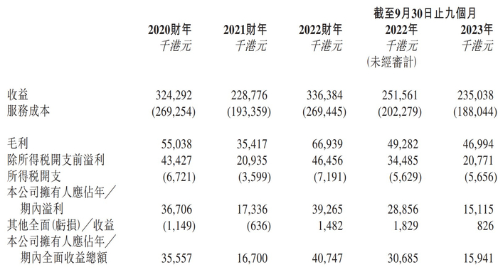 财务方面,于2020年度、2021年度、2022年度以及2023年9月30日止九个月,泓基集团实现收益分别为3.24亿港元、2.29亿港元、3.36亿港元、2.35亿港元。其中,公司期内溢利分别为3670.6万港元、1733.6万港元、3926.5万港元、1511.5万港元。