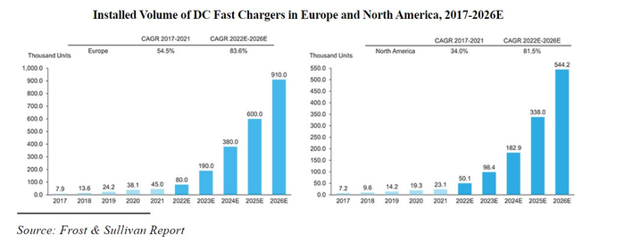 弗若斯特沙利文表示,欧洲市场的直流快速充电器安装量有望从2022年的8万台增至2026年的约91万台,年复合增速83.6%;同时,北美市场中2021年的直流快速充电器安装量为2.3万台,预计到2026年将达到54.4万台,年复合增速81.5%。
