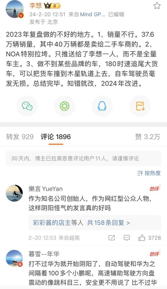李想最近反讽复盘2023,也被一些人认为格局太小,评论区骂声一片。
