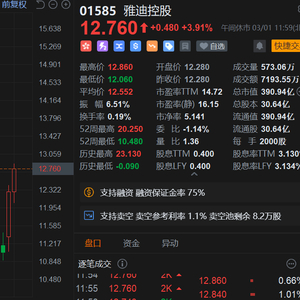 雅迪控股(1585.HK)延续昨日涨势,午间收涨近4%报12.76港元,2日连涨超15%,总市值391亿港元。