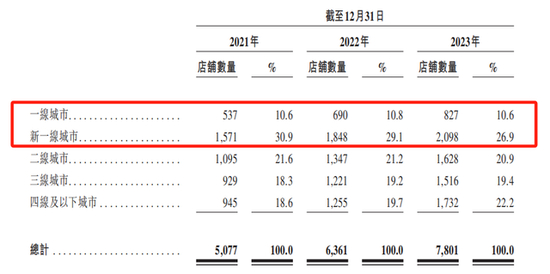 茶百道的门店主要集中在一线、新一线城市,并以加盟商为主,截止2023年底,总计开出7801家门店,其中加盟店为7795家,99%以上加盟店。目前公司拥有5538名加盟商,其中595名加盟商经营超过两家门店。