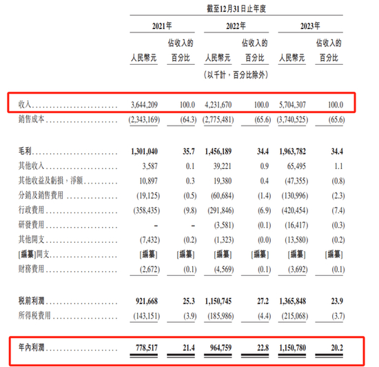 财务数据方面,在过去的2021年、2022年和2023年,茶百道的营业收入分别为36.44亿、42.32亿和57.04亿,同期公司的净利润分别为7.79亿、9.65亿和11.51亿元。另外,同期公司的毛利率为35.7%、34.4%和34.4%。