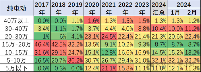 纯电动车随着成本的下降和产品提升,5万以下的电动车与30万元以上的电动车表现较平稳。这其中特斯拉仍列在20万以上,防止结构波动太大。