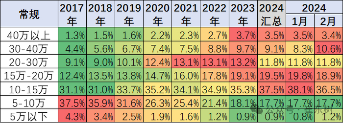 3月10日,乘联会秘书长崔东树发文称,根据乘联会数据,全国乘用车市场价格段销量结构走势持续上行,高端车型销售占比提升明显,中低价车型销量占比减少,这是消费升级的推动,同时也是因为换购群体的消费升级推动。2024年进一步强化车市结构高端化特征,2024年2月乘用车市场零售出现暂时低迷。