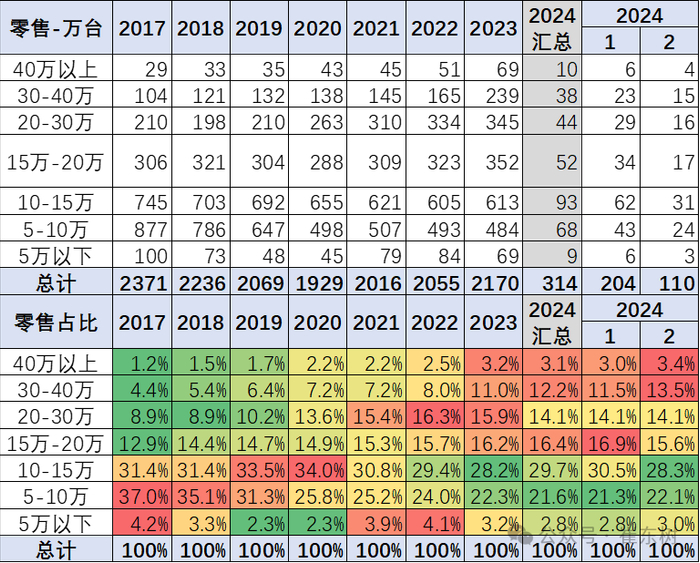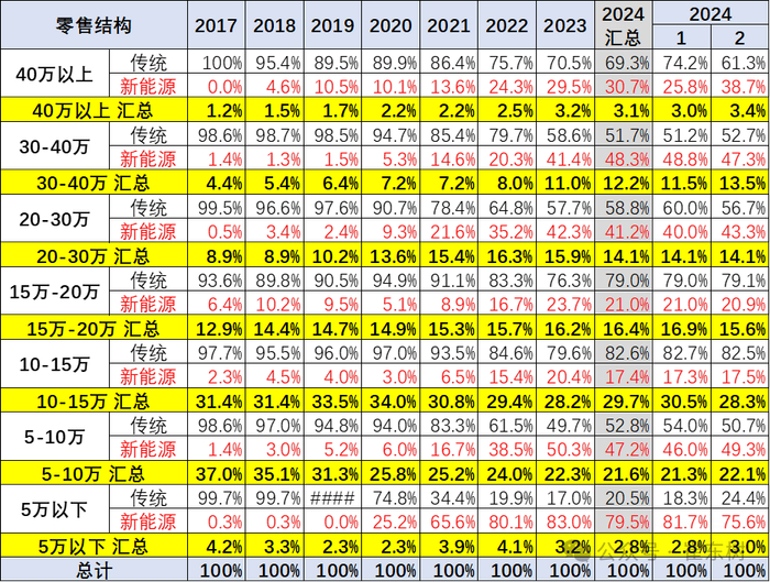 从结构分析看,入门级萎缩,消费基盘不扎实的问题较大,中低端购买力不足,价格战也明显爆发。传统燃油车价格段上行的现象并不是促进消费的有利因素,需要普通消费群体更强的购买入门级车消费,也就是低端消费很重要。因此改善普通群体需求购买力,实现车市价格端相对均衡,拉动入门级消费,实现首购群体的消费升级。