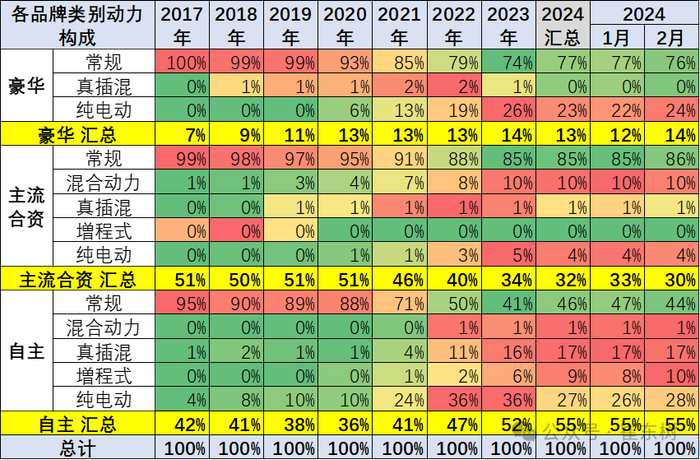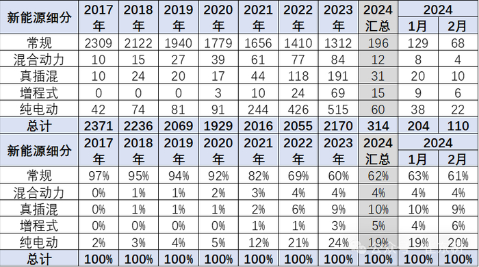 2024年自主品牌表现很好,新能源全面发力,增程与插混表现均很好。总体看新能源的优势区域在自主的创新技术带来的高端油电混动较突出,新势力的结构波动较大,增程表现较好。
