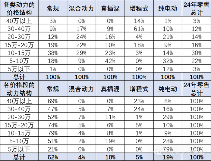 传统燃油车是在10-20万元表现相对较强,形成了差异化分布的特征,尤其是混合动力的分布相对较窄,属于中高价区间的产品为主,而插电混动属于主流车型为主的一个。年初的低端市场萎缩较严重,这也是消费较弱的影响对低端冲击更大。