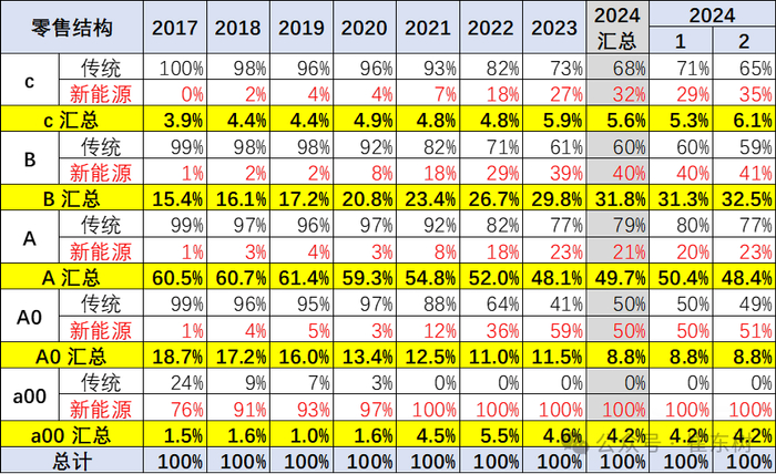 B级车和C级的新能源渗透率大幅提升,体现高端电动化的优势明显。