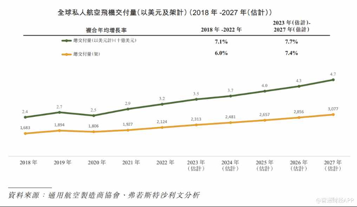 弗若斯特沙利文报告显示,就已交付数量而言,通用航空(包括私人航空飞机及固定翼专业航空飞机)是世界上最大的航空市场。于2023年,通用航空飞机交付市场共计交付3,050架新飞机,价值约234亿美元。按交付量计,私人航空市场虽然占比达到72.6%,2023年交付总数为2,215架,但价值仅约37亿美元。弗若斯特沙利文预测,2027年全球私人航空飞机的交付量预计达到3,077架,价值约47亿美元。