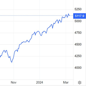 今年以来,美股基准股指——标普500指数上涨超8%,并且自今年以来屡创新高,不断刷新历史新高点位,主要受市场围绕人工智能的投资狂潮和美联储今年降息预期的大力推动。截至周一美股收盘,标普500指数收于5117.94点位。