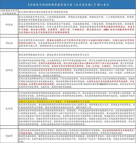 此次披露的“征求意见稿”正是从研发端、审批端、进院端、支付端和投融资这五大维度,整体切入创新药发展面临的关键问题,务实给出政策指导。
