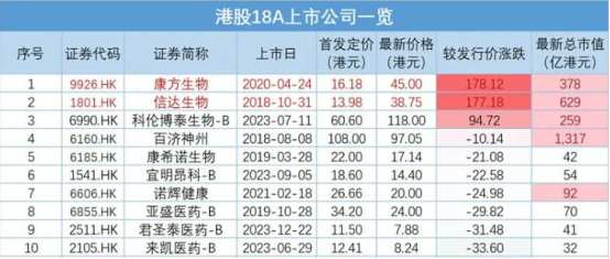 二级市场上创新药企处境同样不乐观。若按较发行价涨幅排名,港股生物医药板块前10的药企中仅有3家企业的股价浮动为正值。此前荣昌生物因“现金流短缺”流言导致港股股价大跌22%,便是市场信心缺乏的典型案例。