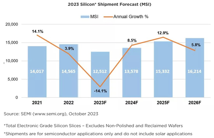 SEMI(国际半导体产业协会) 在最新公布的年度硅出货量预测报告中指出,随着硅晶圆和整个半导体行业需求复苏和库存水平正常化,以及硅晶圆需求大幅增加以支持人工智能 (AI)、高性能计算 (HPC)、5G、汽车和工业应用等领域,全球硅晶圆出货量将在2024年全面反弹,2025年有望更加强劲。SEMI硅晶圆数据包括硅晶圆制造商发往最终用户的抛光硅晶圆和外延硅晶圆,不包括未抛光或回收的晶圆。这些硅晶圆将被送至台积电等芯片制造商处进行精细加工,通过极其复杂的制造过程在硅晶圆上制成集成电路(ICs)。