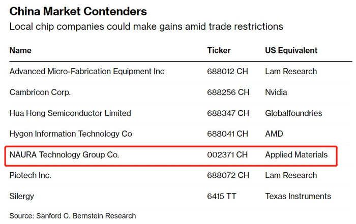 来自巴克莱银行(Barclays)和伯恩斯坦公司(Sanford C. Bernstein)的分析师们表示,Naura Technology Group(北方华创)等半导体设备公司的名字有一天可能将与应用材料以及泛林集团(LAM Research)等美国半导体设备同行一样闻名全球。其中,伯恩斯坦分析师们将北方华创直接对标半导体设备巨头应用材料(Applied Materials)。
