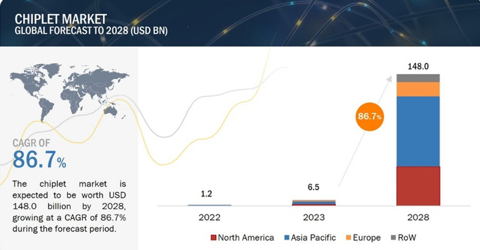 IDC预计至2024下半年,台积电CoWoS产能有望大幅增加约130% 。另一研究机构Markets And Markets最新研究显示,覆盖GPU、CPU、FPGA等芯片的Chiplet先进封装成品、先进封装技术(2.5D/3D、SiP、WLCSP、FCBGA和Fan-Out等)的Chiplet市场总额有望于2028年达到约1480亿美元,年复合增速(CAGR)高达惊人的86.7%。根据该机构测算,2023年Chiplet市场总额可能仅为65亿美元。