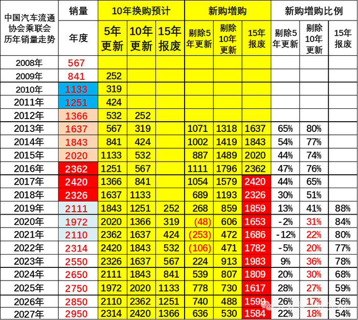 过去几年由于车市出现疫情的干扰,所以2020年-2022年都出现了报废更新延期的现象,按照五年更新期测算,2020年-2022年都出现了负的新购销量,现有销量可以基本被增换购给覆盖,因此基本是换购的延期。