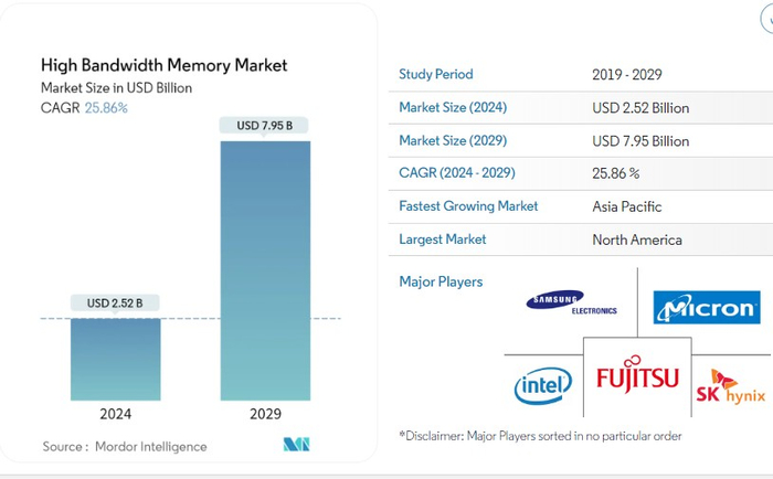 知名研究机构Mordor Intelligence预测数据显示,HBM存储产品的市场规模预计将从 2024年的约 25.2 亿美元激增至 2029年的 79.5 亿美元,预测期内(2024-2029年)复合年增长率高达 25.86%。