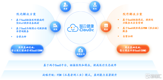 智云健康是中国最大的数字化慢病管理方案提供商,它基于医院和药店SaaS(软件及服务)部署量以及透过该服务开出在线处方量,主要为包括医院、药店、制药公司、患者和医生在内的价值链上的主要参与者提供服务及实现数字化,它的主要服务包括两大部分:院内解决方案和院外解决方案(包括药店解决方案和个人慢病管理解决方案),即其营业收入来自这两大部分服务的销售实现。
