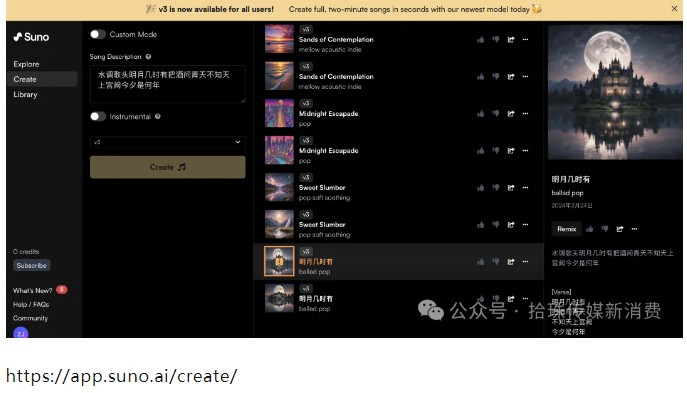 尽管Suno V3 Alpha在音乐键、节拍(BPM)和混音方面还存在一些问题,但公司鼓励用户测试新版本并提供反馈,以便不断改进产品。Suno AI强调,V3 Alpha在歌曲结构上可能会比V2版本更具创意,有时需要不同的提示才能达到最佳效果。目前,Pro和Premier用户可以自由切换V2和V3 Alpha版本,并得到300免费积分用于尝试新模型。Suno V3模型的发布,不仅为音乐创作者提供了一个全新的创作工具,也为音乐产业带来了无限的可能性。
