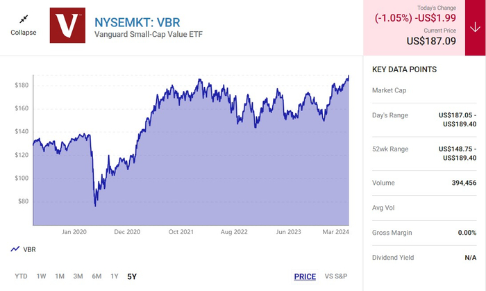 利用美股小盘股和大盘股之间,以及成长和价值之间的“重大脱节”,一个很好的方法是将资金投资于“先锋小盘股价值ETF” (美股代码:VBR)。顾名思义,先锋小盘股价值ETF是一种交易所交易基金(ETF),投资于具备“价值股属性”的小盘股,整体持仓更偏重于“价值”这一属性。这些具备价值特性的小型公司基本面扎实其估值较低,因此这只ETF可能是击败标普500指数ETF的最佳选择之一。