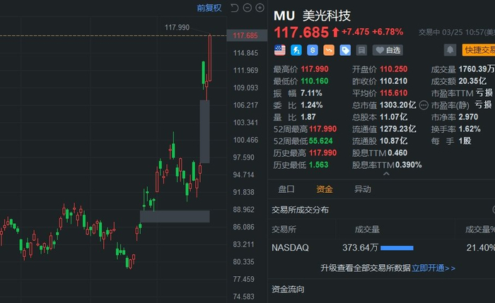 美光科技(MU.US)大幅上涨约7%,最高报117.99美元刷新上市高价,市值超1300亿美元。消息上,日前公布得2024财年第二财季营收58.2亿美元,同比增长约57.7%,增速远超第一财季的15.6%,高于分析师预期的53.5亿美元。美光预计,第三财季营收指引范围在64亿至68亿美元,同比增长近71%到81.3%,好于分析师预期的59.9亿美元。此外,TD Cowen将美光科技的目标价从120美元上调至150美元,维持“跑赢大盘”评级。