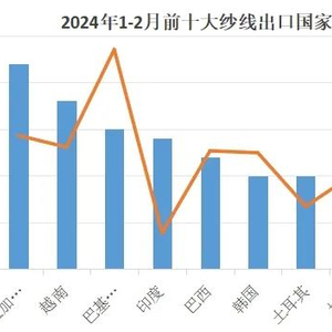 欧洲:1-2月我对欧洲纱线出口同比下降15.1%。排名前十的国家和地区中,除葡萄牙和比利时有小幅增长外,分别增长6.0%和6.4%,其余8国均呈两位数下降。其中降幅最大的是波兰,同比下降30.7%。
