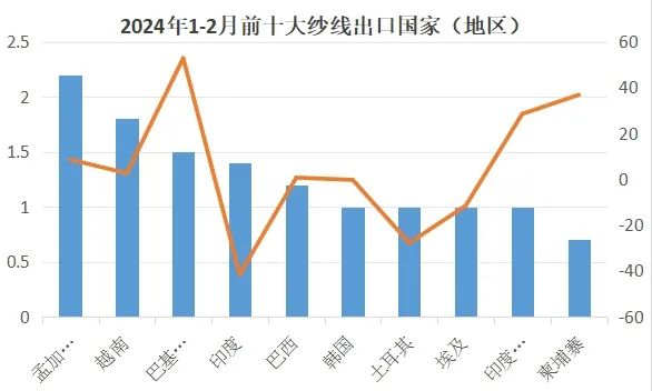 印度尼西亚和柬埔寨:1-2月,我对印度尼西亚和柬埔寨纱线出口分别为1和0.7亿美元,同比增长28.5%和增长36.8%。