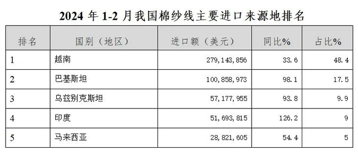 2024年1-2月,我进口纱线8.2亿美元,同比上涨37.1%,进口量29.5万吨,同比增长48.3%。纱线进口拉动纺织品进口15.7个百分点,拉动纺织服装进口7.4个百分点。