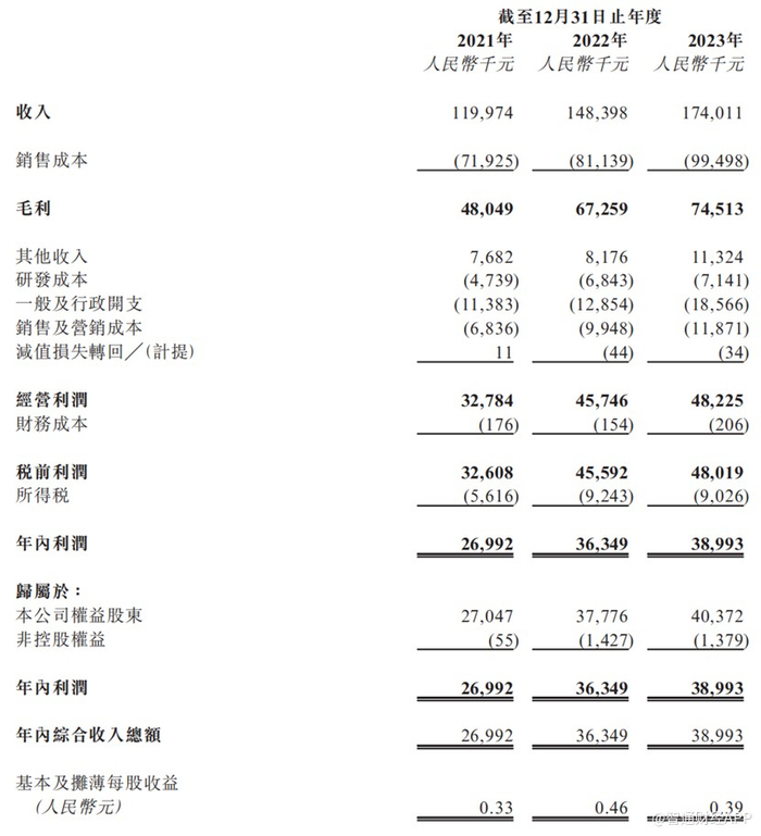 根据招股书披露,近年来众淼创新科技的业绩有着显著增长,营收与利润双双高增。2021年、2022年及2023年,众淼创科实现收入分别约为1.20亿元、1.48亿元及1.74亿元(单位为人民币,下同),复合年增长率为20.4%;净利润分别约为0.27亿元及0.36亿元及0.39亿元。