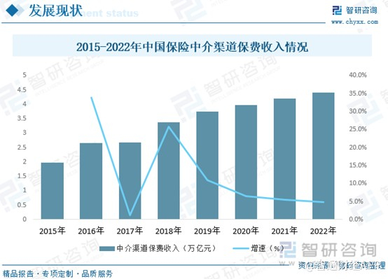 作为我国保险销售的主要渠道,保险中介在国内保险市场逐渐成熟规范的进程中一直扮演着重要的角色。据智研咨询统计,2015-2022年我国保险中介渠道保费收入不断增长,截至2022年保险中介渠道保费收入约为4.4万亿元。