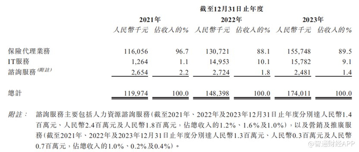在业务层面,尽管众淼创科拥有保险代理服务、IT服务及咨询服务三类业务,但其核心业务依然是保险代理业务,2021年至2023年,保险代理业务的收入分别为1.16亿元、1.31亿元及1.56亿元,分别占总收入的96.7%、88.1%及89.5%。