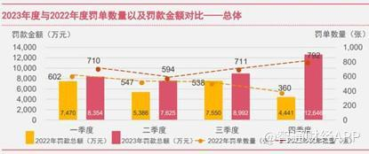 从季度处罚趋势看,2023年度罚款金额及罚单数量在各季度较去年均有所上升。其中,第四季度上升幅度最大,罚单数量上升120%,罚款金额上升185%。