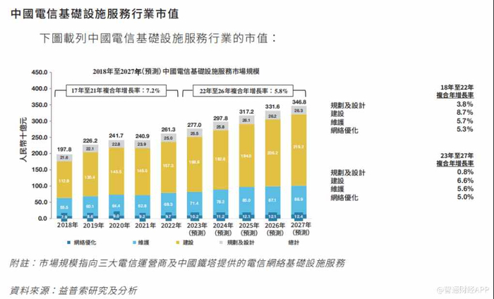 从行业发展趋势看,益索普报告显示,中国电信基础设施服务行业的整体市值由2018年约1978亿元增长至2022年约2613亿元,复合年增长率约7.2%,由大规模4G及5G基础设施建设服务需求主导。整体市值估计将由2023年约2,770亿元增加至2027年约3,468亿元,复合年增长率约5.8%。基础设施建设服务在可见将来将继续成为市场的主要驱动力。
