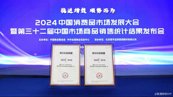 此次会议发布了2023年度中国市场商品销售统计结果。2023年度市场销售领先品牌中,日化品牌蓝月亮持续领跑,洗衣液连续15年(2009-2023)、洗手液连续12年(2012-2023)位列同类产品市场综合占有率第一。
