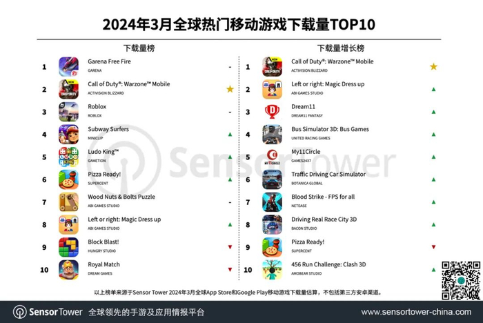 3月全球热门移动游戏下载量TOP10发布 Garena《Free Fire》位列榜首